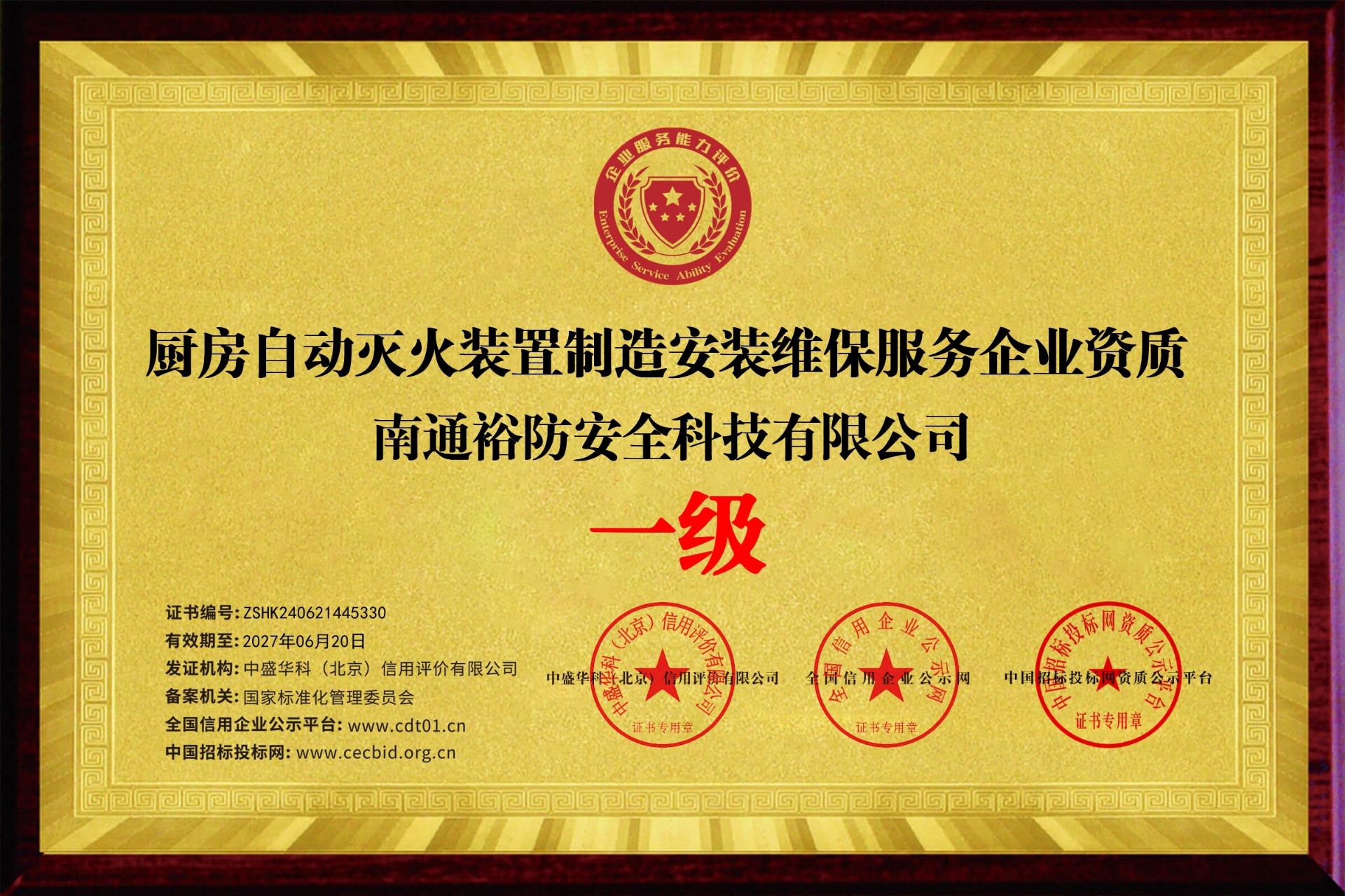 厨房灭火装置制造安装维保服务企业资质荣誉证书